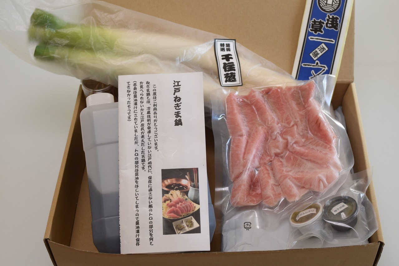 日本近海産地限定 本鮪・江戸東京野菜千住ねぎ・薬味を4人前、特製鍋つゆ1本をセットにしました。
